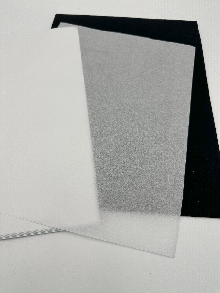 ②拷貝紙:非常に薄くて半透明な紙で、印稿をなぞったり転写する際に使ったり、側款の拓をとる際に印箋の上に敷いて刷毛で圧迫しても印箋が破れないように使用する紙です。印譜帳を作る際には、連史紙を折り曲げ、間に拷貝紙を挟んで製本することで裏面まで印泥の油が染みないようにします。ちゃんとした印譜帳には必ず入っています。