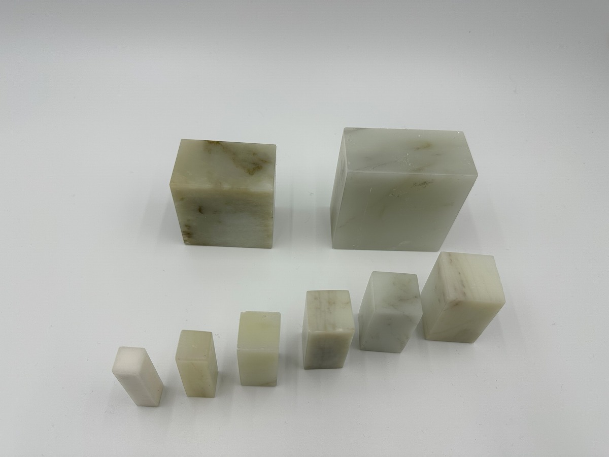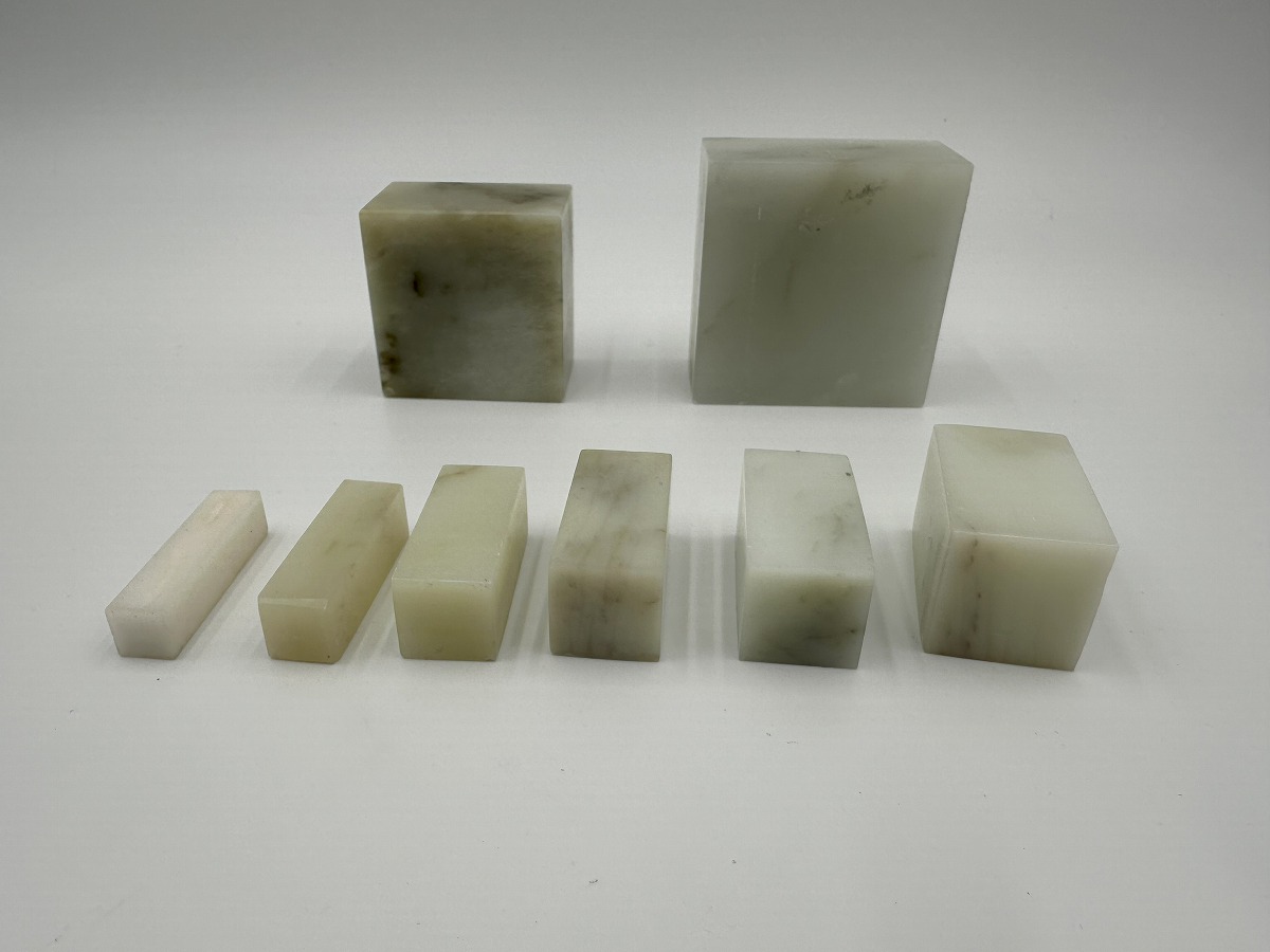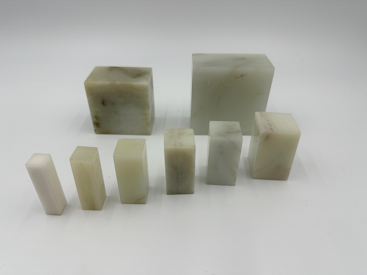 甘粛省から産出される白蝋石で、蝋を刻す如く簡単に篆刻でるので蝋石とも呼ばれます。印面の雑物や亀裂がほぼないので学校教材や初心者向けの教材、ご高齢の方の篆刻教材として重宝する反面、軟らかい石のため印面が変形しやすく本格的な篆刻には不向きです。最近では甘粛省の蝋石が産出されず、他地域の蝋石が同名で混入してきますが毎回名前を変えるのも大変なので一律に当初の蘭州白石として販売しますのでご了承願います。